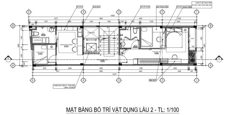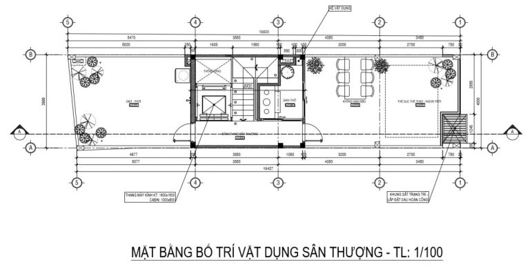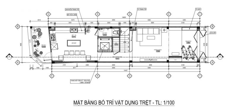 Mặt bằng bố trí vật dụng nhà trệt 2 lầu sân thượngKhu vực phía trước tầng trệt được dùng làm gian để xe, kết hợp bố trí đàn piano làm tăng tính thẩm mỹ và gây ấn tượng ngay từ giấy phút đầu tiên. Thiết kế kết nối với gian để xe là phòng khách rộng 4x4m4 và bếp ăn rộng 4x5m5, bố trí đầy đủ các vật dụng cần thiết cho mỗi khu vực mà vẫn đảm bảo không gian sử dụng tiện nghi, thoải mái.Tận dụng không gian ở sảnh thang trệt là kho và nhà vệ sinh, kết hợp thang máy kính tiện lợi cho việc di chuyển của bố mẹ CĐT và sinh hoạt gia đình.