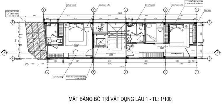 Đáp ứng yêu cầu của chị Kỳ về việc bố trí không gian sinh hoạt riêng cho các thành viên, kiến trúc sư đã tận dụng tối đa diện tích lầu 1 của ngôi nhà 4x18m để sắp xếp 3 phòng ngủ và 2 nhà vệ sinh. Bản vẽ còn được phác thảo chi tiết, bao gồm cách bố trí các vật dụng như bàn trang điểm, kệ, bàn làm việc,... giúp chủ đầu tư dễ dàng hình dung cách sắp xếp nội thất cho ngôi nhà.