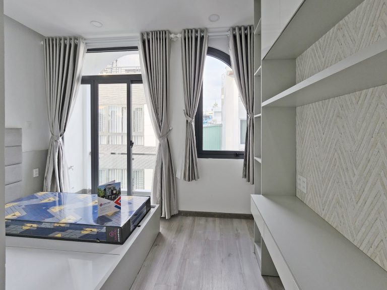 Phòng ngủ kế bên ban công được thiết kế với cửa kính cường lực, tạo cảm giác thông thoáng và hòa nhã. Cửa kính đi kèm với rèm 2 lớp, giúp điều chỉnh ánh sáng phù hợp trong phòng. Nền mỗi phòng ngủ của ngôi nhà 4x18m được ốp gạch giả gỗ màu xám, hài hòa với tổng thể không gian.
