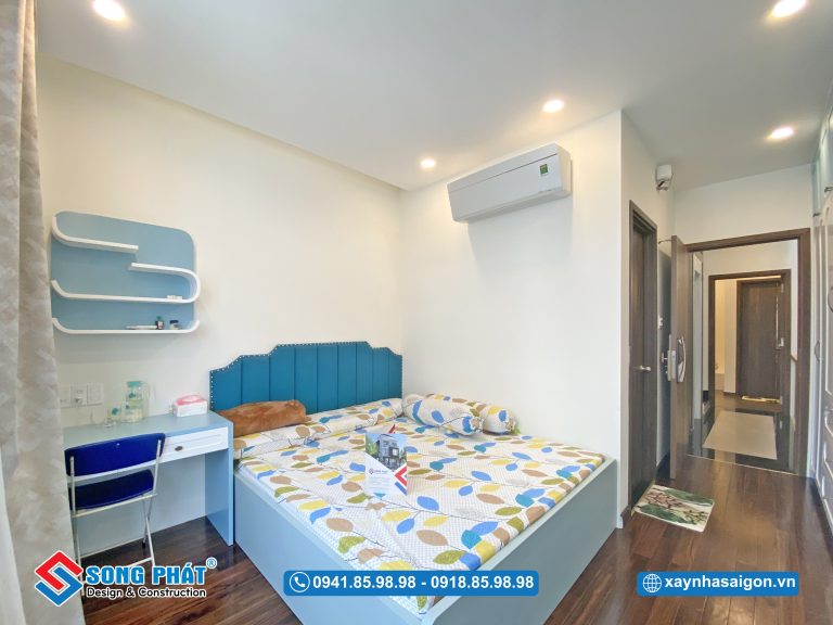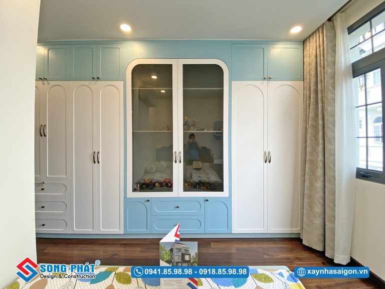 Nội thất phòng ngủ được thiết kế theo tone màu xanh yêu thích của bé