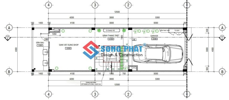 Vơi mong muốn kinh doanh trong tương lai, thể theo yêu cầu của anh chị, kiến trúc sư Song Phát đã đã bố trí mặt bằng tầng trệt đơn giản gồm gian xe máy và không gian kinh doanh phía sau nhà. Vì chưa định hướng cụ thể sẽ kinh doanh mặt hàng gì nên các vật dụng cụ thể chưa được thể hiện trong bản vẽ.