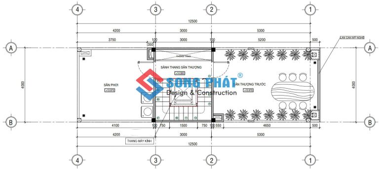 Mặt bằng sân thượng được chia thành hai phần: sân thượng phía trước và khu vực sân phơi phía sau. Khu vực sân thượng trước, với diện tích hơn 20m², được KTS gợi ý làm không gian thư giãn. Bản vẽ chi tiết đã bố trí sẵn bàn ghế và cây xanh, mang đến cho gia chủ một không gian lý tưởng để tận hưởng không khí trong lành và hòa mình với thiên nhiên, tạo nên một nơi nghỉ ngơi thoải mái ngay trong ngôi nhà.