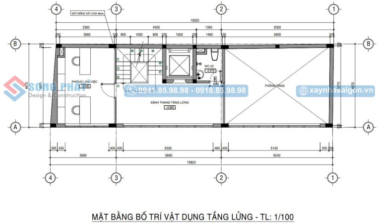 Tầng lửng được bố trí một phòng làm việc thoáng đãng. Bên cạnh đó, nhà vệ sinh chung được thiết kế tiện lợi, phục vụ nhu cầu sinh hoạt cho cả gia đình cũng như hoạt động kinh doanh của CĐT anh Thạch.