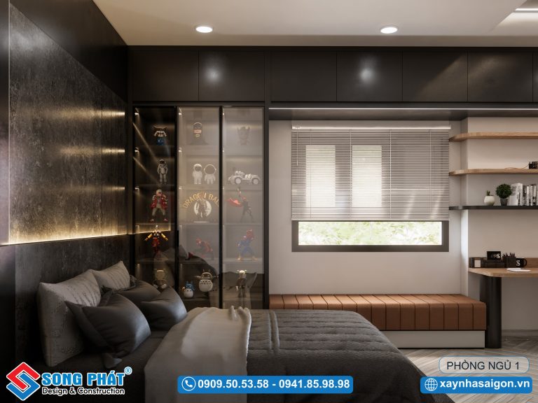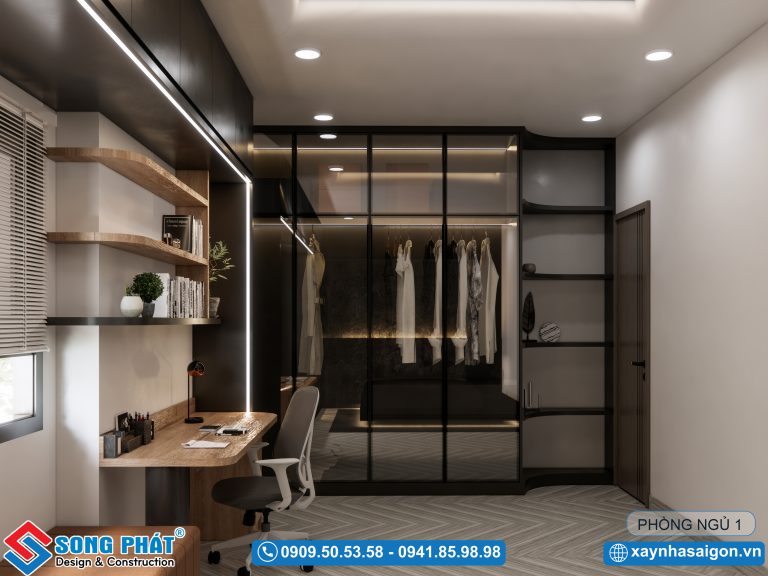 Phòng ngủ 1 được trang trí tương tự như phòng ngủ master, với bàn làm việc nhỏ và kệ treo tường gần tủ quần áo, tối ưu hóa không gian sinh hoạt và tính thẩm mỹ. Sàn nhà được ốp gạch giả gỗ kiểu xương cá, tạo điểm nhấn nổi bật cho tổng thể không gian.
