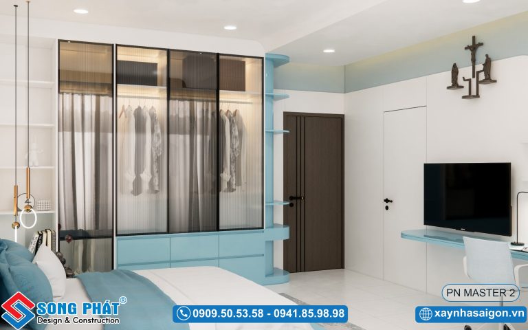 Lầu 3 có một phòng ngủ master rộng rãi ở phía trước và một phòng ngủ thường ở phía sau. Diện tích phòng ngủ thứ ba được thu hẹp để bố trí thêm gian giặt phơi nhỏ, phục vụ nhu cầu hàng ngày của gia đình.