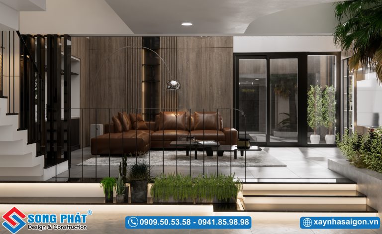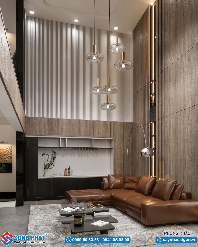 Không gian nội thất của ngôi nhà được thiết kế theo phong cách hiện đại, sang trọng nhưng không cầu kỳ, với gam màu nâu trầm làm sắc chủ đạo. Trần thạch cao giật cấp kết hợp đèn LED bố trí hợp lý tạo nên vẻ nổi bật và ấn tượng. Điểm nhấn tường giả gỗ và lam trang trí ở phòng khách mang đến không gian ấm cúng và sang trọng.