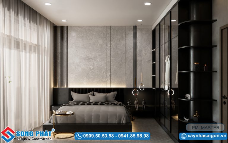 Phòng ngủ master được thiết kế tối giản, sang trọng với gam màu đen xám làm chủ đạo. Đường phào chỉ âm tường tăng thêm sự huyền bí và tinh tế, phản ánh phong cách cá nhân của gia chủ. Tủ quần áo kịch trần bằng kính kết hợp với ngăn trang trí nâng cao giá trị thẩm mỹ cho không gian.