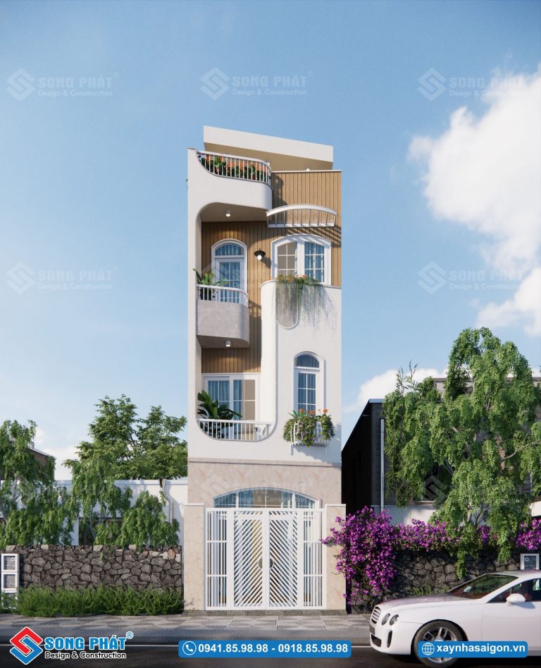 Bỏ qua những lối mòn thiết kế thường thấy, công trình này tạo dấu ấn bằng hình khối mềm mại, nhấn nhá bằng đường cong tinh tế và gam màu trung tính thanh lịch. Mặt tiền nhà 4 tầng sử dụng lam gỗ nhựa kết hợp với hệ cửa kính cường lực và lan can uốn cong sơn tĩnh điện – tất cả hòa quyện tạo nên một tổng thể vừa hiện đại vừa gần gũi.